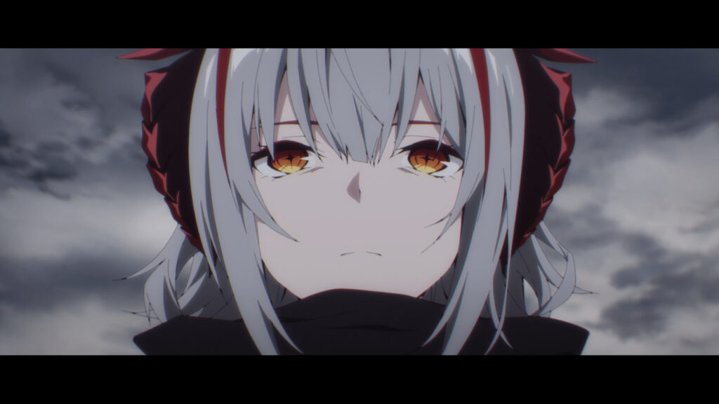 そんなクリュスの髪型は銀髪のロングヘアーで、前髪の生え際辺りにアホ毛が一本生えており、感情によって時々アホ毛も動くのが特徴的です
